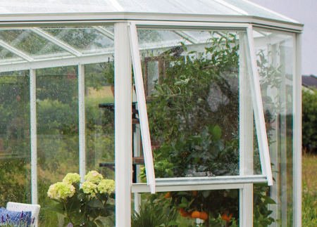 Con respecto a las alturas, independientemente de la altura del muro circundante, en su punto mas alto, este invernadero de cristal tiene 2,85 metros de altura y 2,10 metros en altura de canalón.